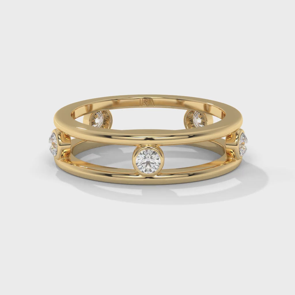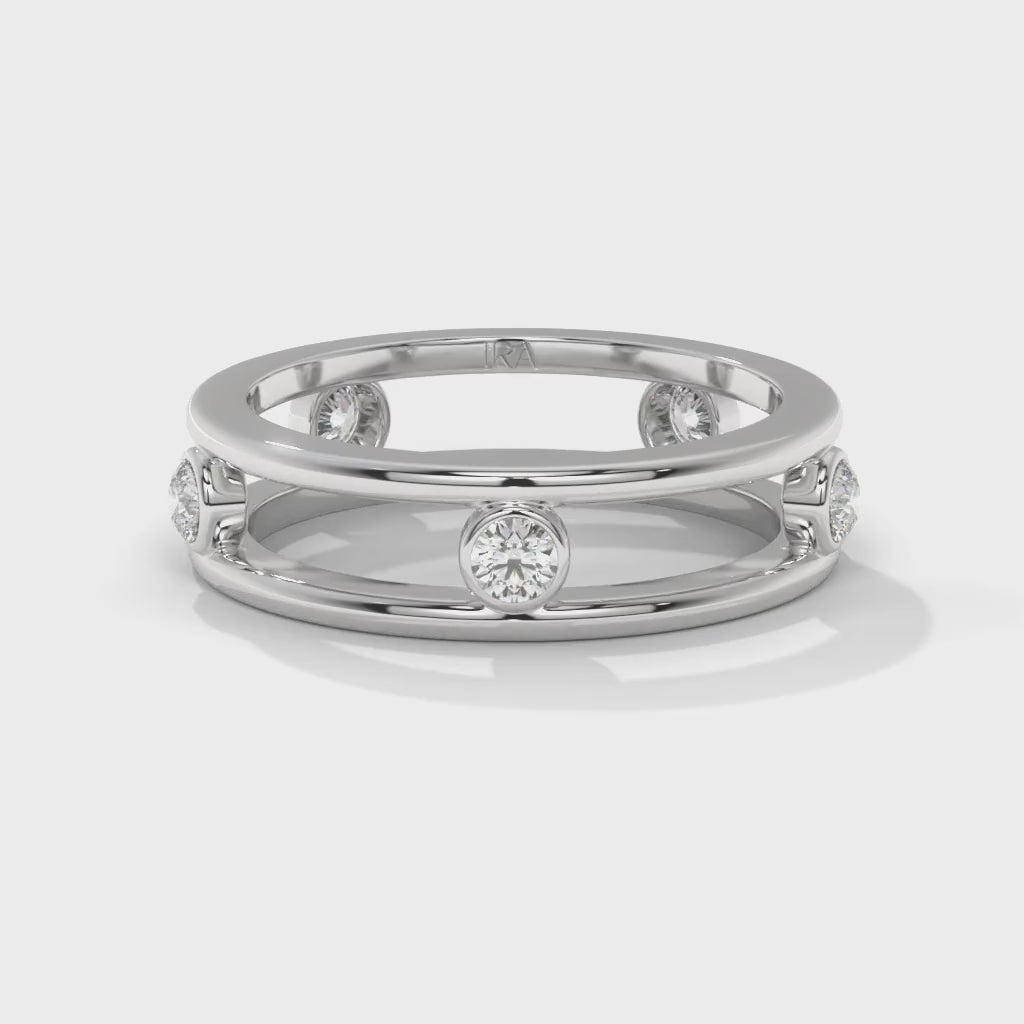 A sleek dual-band design with bezel-set diamonds that appear to float effortlessly. The Float Band is crafted for those who love understated elegance with a touch of modern brilliance.